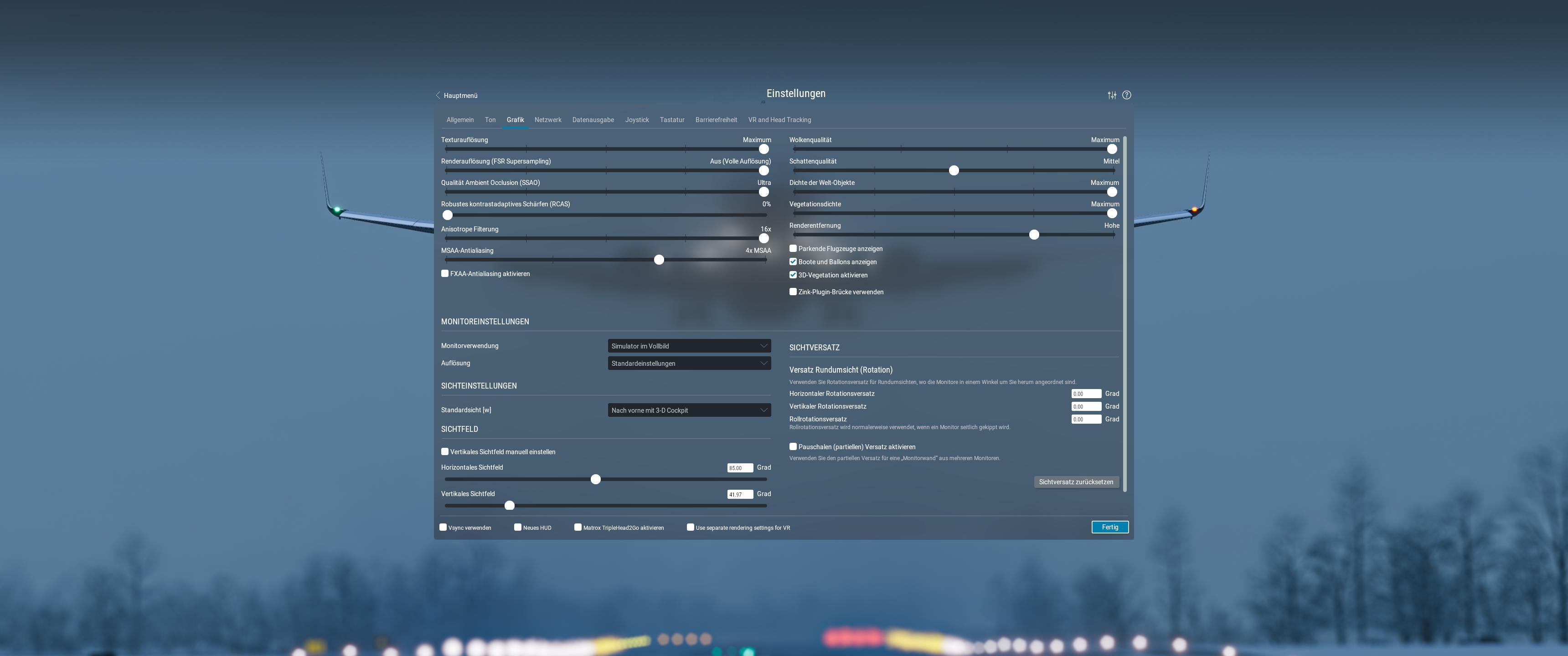 Das ist vermutlich eher dem Umstand geschuldet, dass simHeaven+XP12.4.0b1 aus einer deutlich "schwächeren" fps-Position startet, als der Vanilla-Simulator. Allerdings fordert simHeaven in Hinblick auf die exorbitant erhöhte Anzahl darzustellender Objekte, mehr Leistung an bestimmten Stellen, als das, was XP12-Standard benötigt. Insofern könnte es hier einen Dämpfer geben Bei mir hat 12.4.0b1 unter gleichen Bedingungen mehr als 15% zusätzlichen Schub bekommen. XPlane starte ich (damit die Graka mich nicht mit Getöse nervt) mit --lock_fr=35. Die werden im laufenden Betrieb auch nicht mehr unterschritten. Dazu konnte ich mir jetzt ungestraft erlauben, MSAA eine Stufe anzuheben. Ich verwende einen UWQHD-Monitor mit 3440x1440 pix-Auflösung. Meine Einstellungen: Die Schattenqualität bleibt bei mir (ich sehe da kaum zusätzlichen Nutzen) immer auf Mittel. Beim Thema "Rendererentfernung" habe ich intensiv probiert, aber bei 2 Meter Abstand zum Monitor keinen Unterschied zwischen Maximum und hoch entdecken können. Also bleibt es bei "hoch", die CPU dankt es mir mit 1-2 frames Speicher-Laufwerke sind, sofern SSD im Einsatz sind, aus meiner Sicht im Moment eher weniger relevant: Ich habe 2 Stück m.2-SSD an jeweils 4 freien PCIe-Lanes hängen. Außer den von der Graka beanspruchten 16 PCIe-Lanes gibt es keine weitere Hardware an irgend einer Lane. Simulator und O4XP-Kacheln habe ich dazu auf jeweils einer der beiden SSD getrennt gespeichert und so theoretisch noch einmal Schub gegeben. Beim Start saugt XP12 knapp 20GB ins RAM, die Ladezeit muss ich aber immer noch in Minuten angegeben. Da wird deutlich, wie XPlane an den Vektor-Daten aus den O4XP-Kacheln zu knabbern hat. Falls du ZL=17 verwendest, könnte ein Test mit ZL=16 hilfreich sein. -