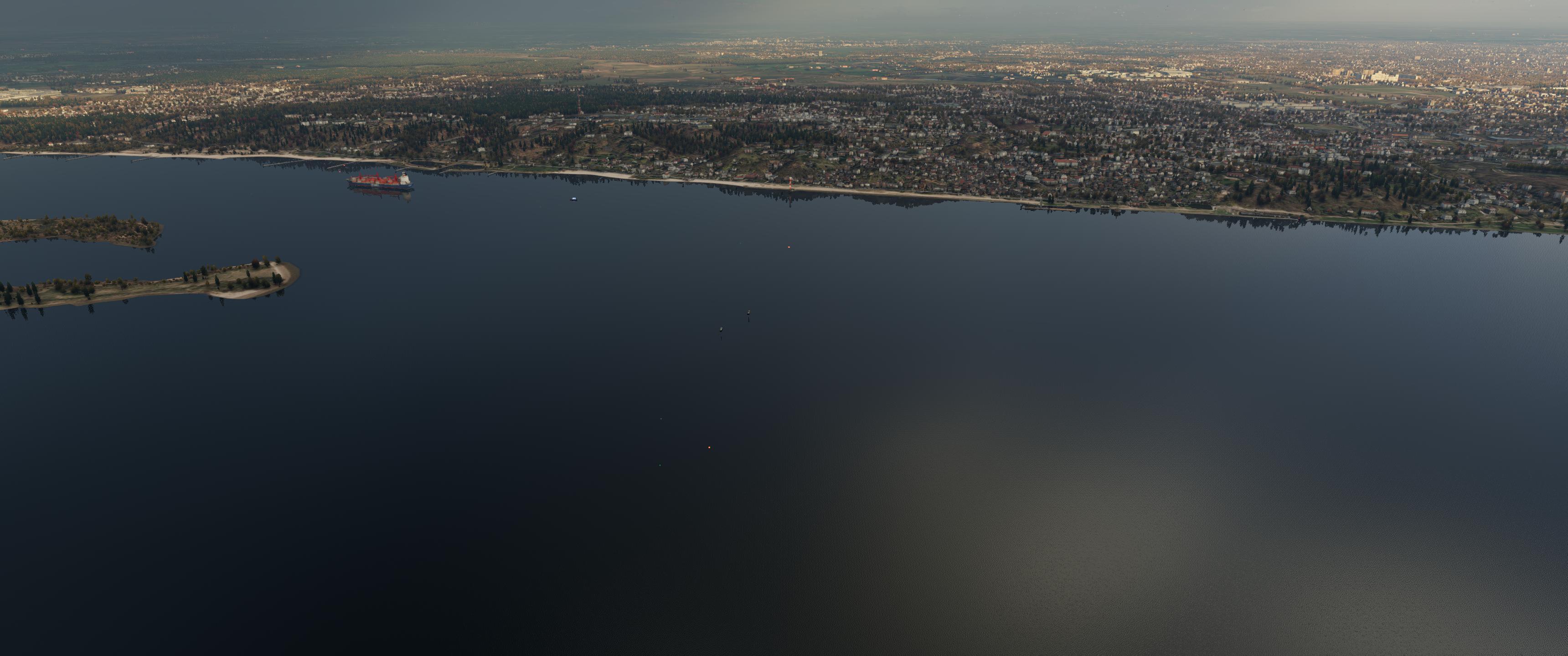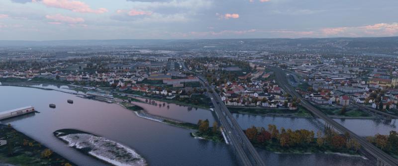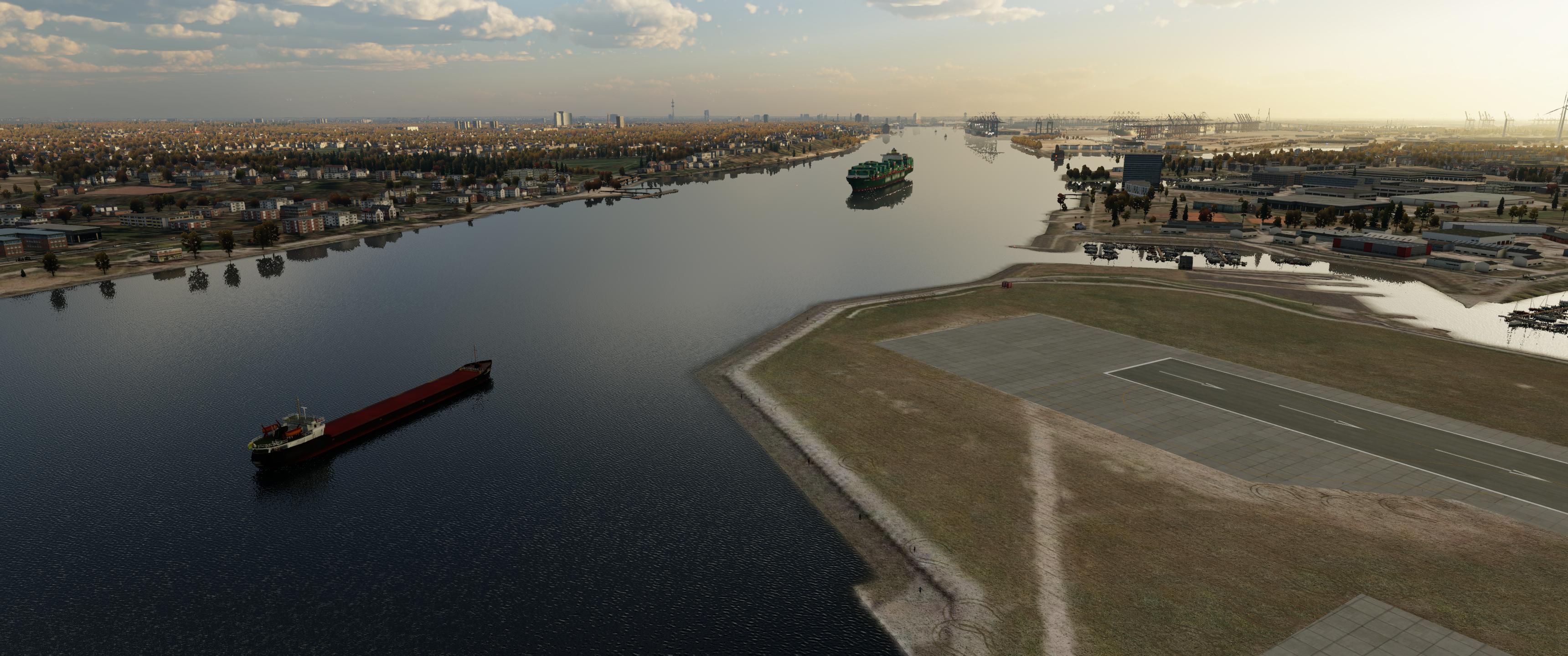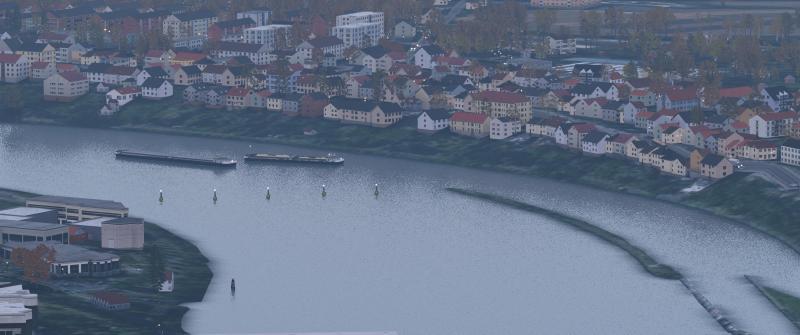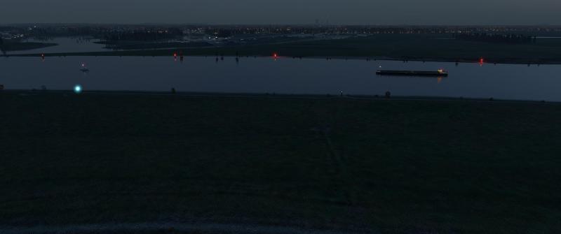 Nein, aber der Schiffsverkehr wird dynamisch sein: Andre testet gerade meinen aktuellen Arbeitsstand. Mittlerweile habe ich zu jedem Wasserstraßen-Typ mindestens einen passenden Objekt-Typ. Es geht jetzt u.a. darum, richtig abzumischen. Hört sich einfach an, ist aber sehr schwierig, weil sich die Schiffsobjekte sehr langsam bewegen, XPlane in bestimmten Abständen, an bestimmten Punkte, Autogen-Objekte injiziert. So war vorhin in Wesel relativ wenig los, obwohl hier gerade ein Motoboot flussaufwärts fahrend, einem Frachter begegnet. Allein das Setzen der Positionslichter, Mast-Beleuchtung, hat mir weit mehr als eine Woche Arbeitszeit abverlangt.