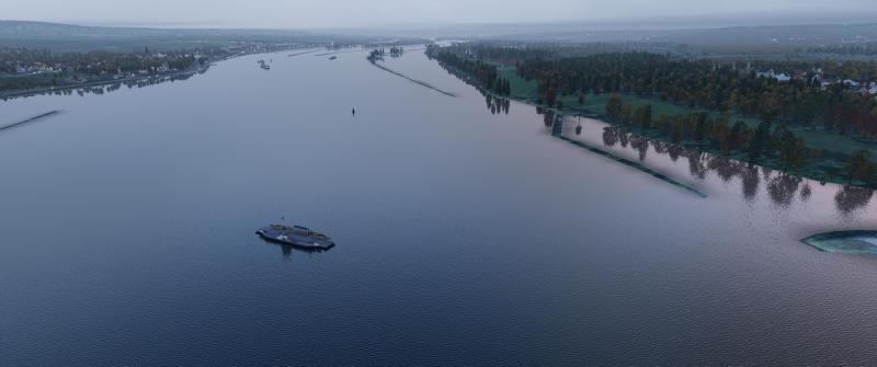 Wichtig ist natürlich auch, dass es eine zufällig gemischte, ausreichende Varianz an Objekten gibt. Es soll ja alles so authentisch wie möglich wirken, trotz etlicher Unzulänglichkeiten, die ich nicht ändern kann. Hier begegnen sich Personen-Fähre und Binnen-Containerfrachter. Beide Schiffe fahren dabei auf unterschiedlichen Wasserstraßen.