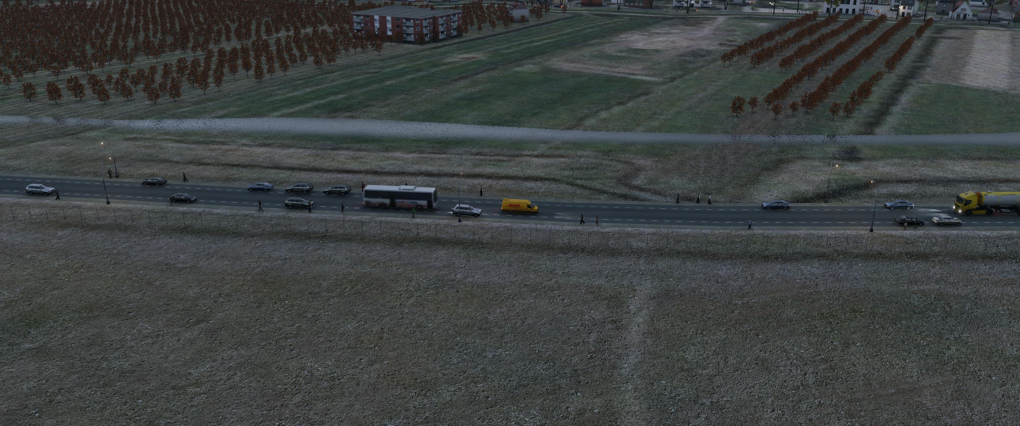 In der library.txt der X-World_Highway_Library finden sich entsprechende Hinweise. Man kann die verwendeten "3D-People-".obj teilweise, oder vollständig durch Austausch gegen "blank.obj" ausknipsen. Genau so einfach, lassen sich auch "3D-People"-Objekte gegen andere austauschen. Ich habe passenderweise am 6.11. die X-World_Highway_Library aktualisisiert, weil in der Vorversion "blank.obj" im Stammverzeichnis fehlte. Über die 3D-People, wie auch den Shrubs entlang von Straßen außerhalb der Ortschaften, möchte ich einfach nur lineare Strukturen "aufreißen". Durch das völlig zufällige Auftauchen dieser Objekte, werden die darunter liegenden, öden XP-Straßensegmente "aufgelockert" und verlieren dadurch ihre linearen, "Lego-Beton-Baukasten-Charme". Technisch wäre das überhaupt kein Problem, aber Arbeitsaufwand und Nutzen stehen an dieser Stelle in keinem (jedenfalls für mich) erträglichen Verhältnis. Ich differenziere ja bereits in mehrere 3D-People-Objekt-Gruppen: Auf den Bürgersteigen entlang von secondary-Straßen ist die Abmischung der "3D-People" eine andere, als z.B. bei "highways", die über OSM als Fußgänger-, oder Fahrrad-Weg in das expnetwork einfließen. Anders sieht es bei den Autogen-Fahrzeugen, bzw. Autogen-Zügen aus: Da sind regionale Kachel-Zonen definiert, die z.B. mit typischen regionalen Einsatz-Fahrzeugen ausgestattet werden können. In den Deutschand-Kacheln verwende ich z.B. "Polizei", "Feuerwehr"-Fahrzeuge, während außerhalb dieser Kacheln die Standard-"Police"-Autos erscheinen. In GB sehen die Züge anders aus, als in D. Könnt ihr mal gucken. Na ja und dass über den expnetwork-Layer z.B. in GB konsequent Linksverkehr realisiert ist, dürfte schon lange bekannt sein.