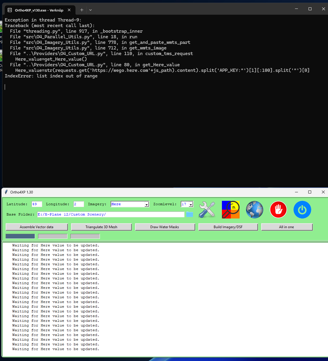 Es gibt aber einen User Shred86, welcher eigeninitiativ Änderungen in einer eigenen Version vornimmt. (GitHub - shred86/Ortho4XP: A scenery generator for the X-Plane flight simulator). Diese abgetrennte, inoffizielle Version steht inzwischen bei "1.40.05". In dieser Fassung ist aber der Fix für Here noch nicht drin. Es muss einfach die oben verlinkte O4_Custom_URL.py ausgetauscht werden.