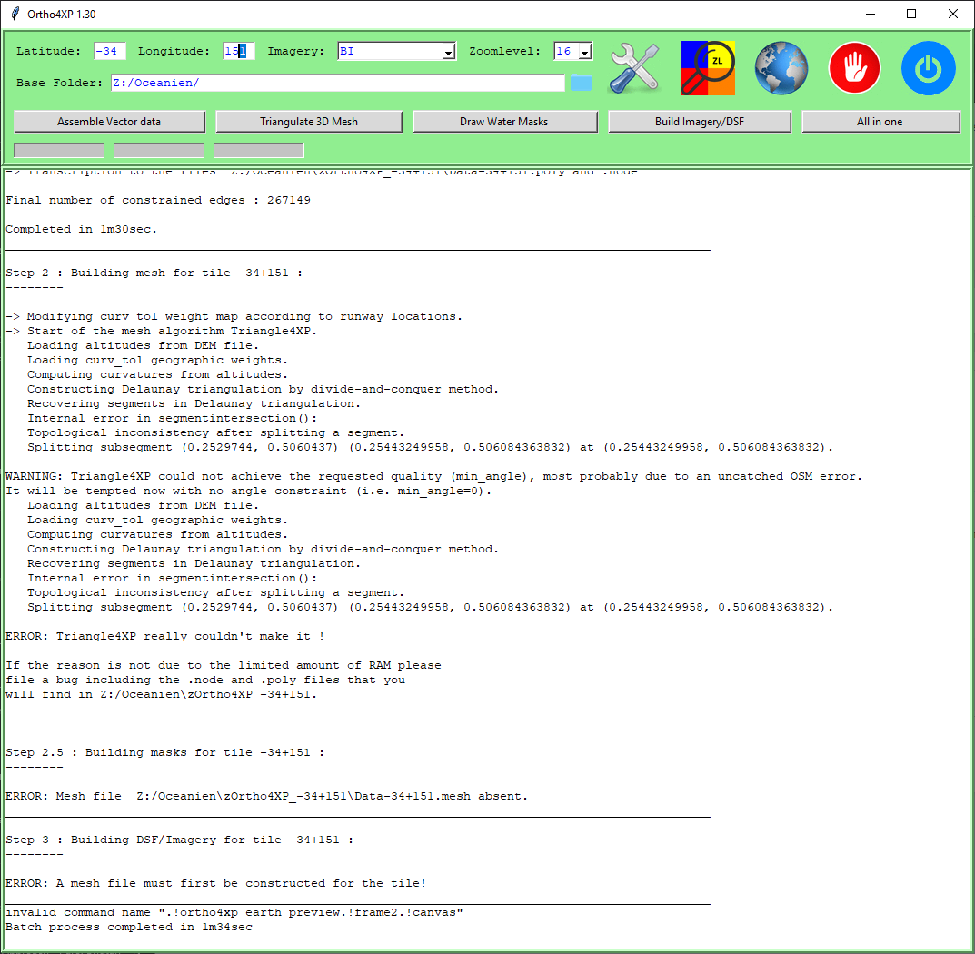 ich habe mir heute Sydney von FlyTampa gegönnt und wollte mir eine Kachel mit dem patch erstellen. Da bekam ich nur Fehlermeldungen. Also habe ich es ohne patch versucht, aber wiederum nur Fehler. Kachel -34+151 funktioniert einfach nicht. Die Kacheln -34+150, -35+150 und -35+151habe ich ohne Fehler erstellt. Ich füge mal ein Bild von den Fehlern bei, vielleicht hat ja jemand noch eine Idee oder kann das mal bei sich selbst testen.
