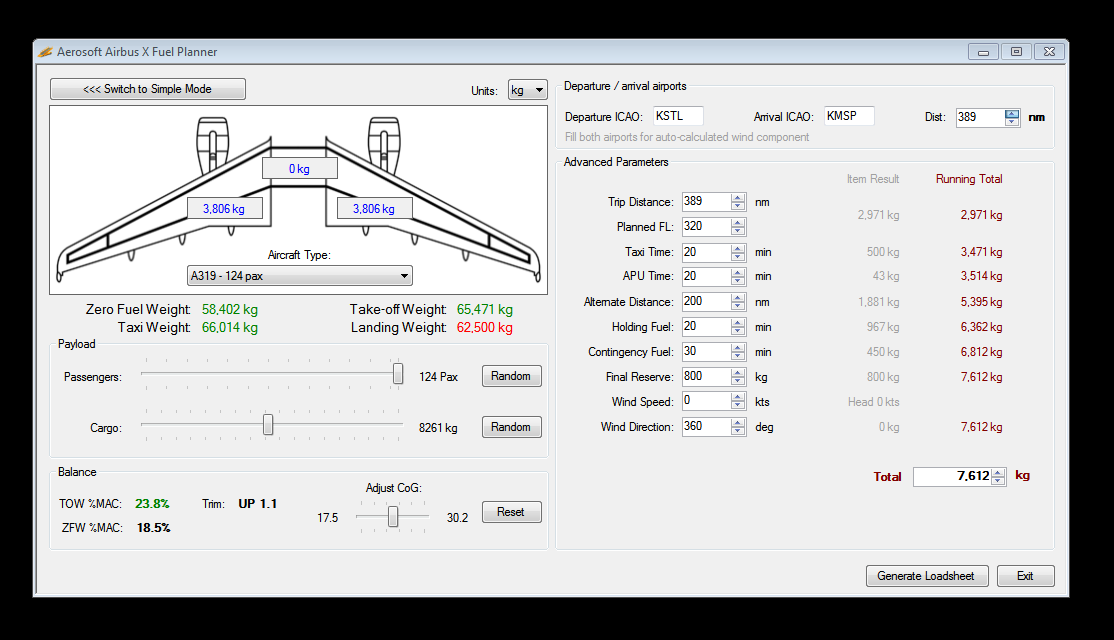 I will check if the ZFW matches the sim (A319) when I add 100pax and 2t baggage (Empty weight of 39.725t plus 100x84kg plus 100x20kg).