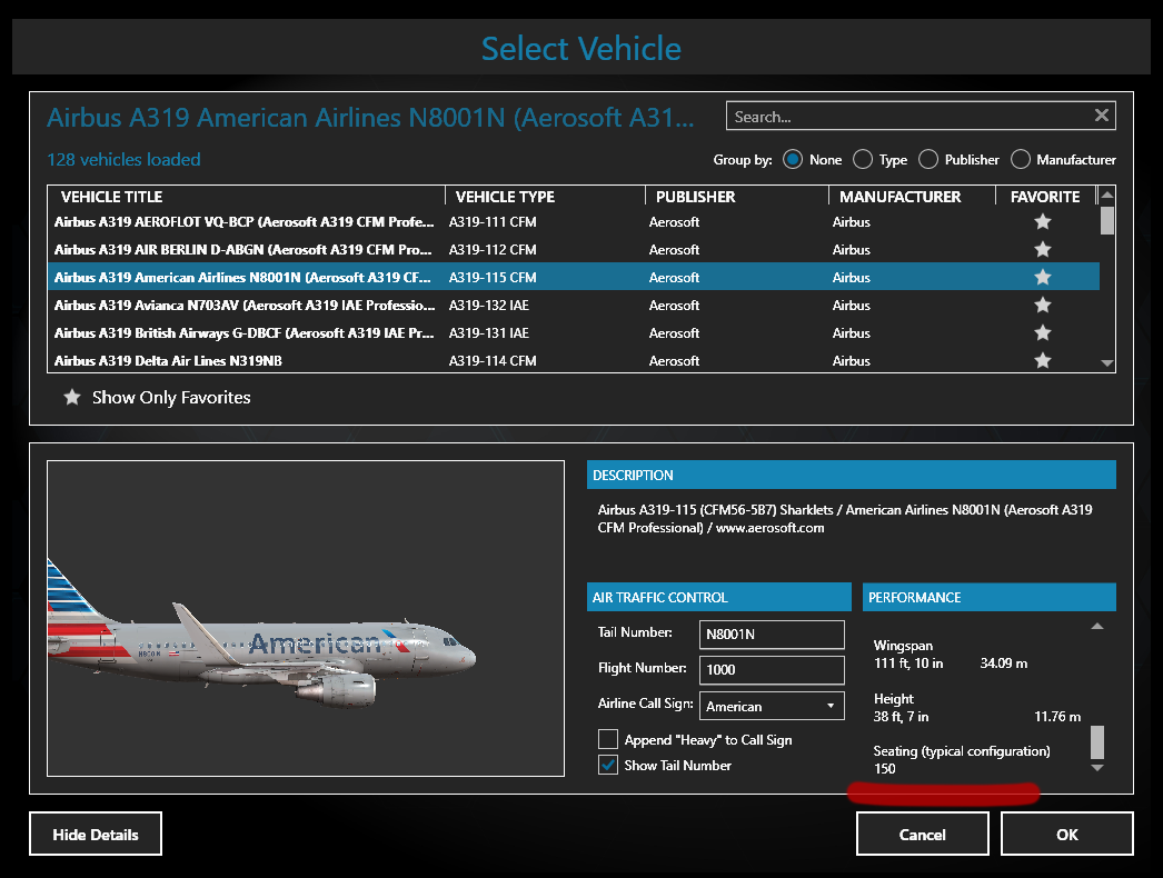 Still, no matter what you choose in the sim, the fuel planer will only have the option for 124 seats: