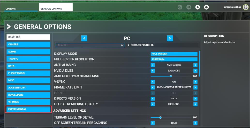 The experimental options panel opens.