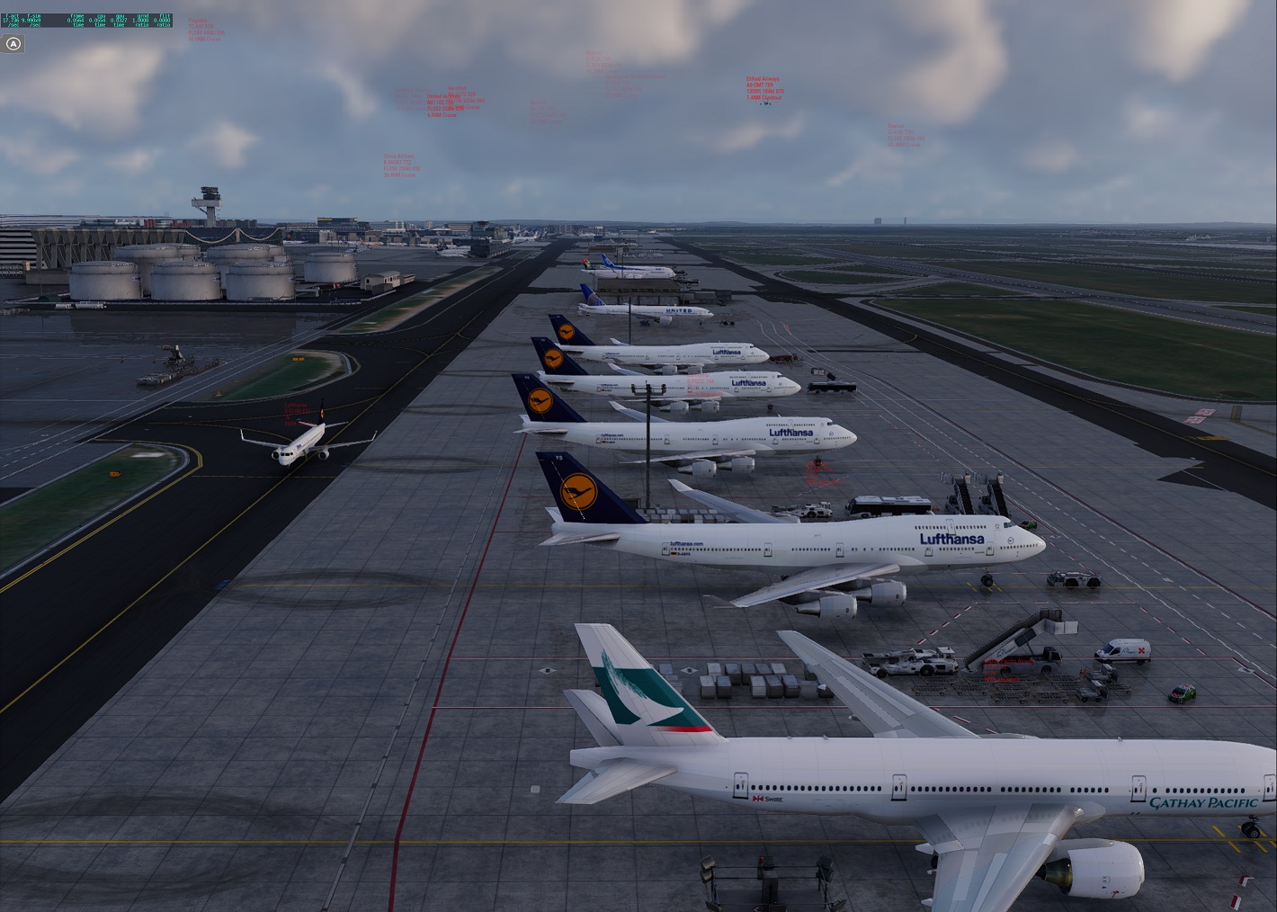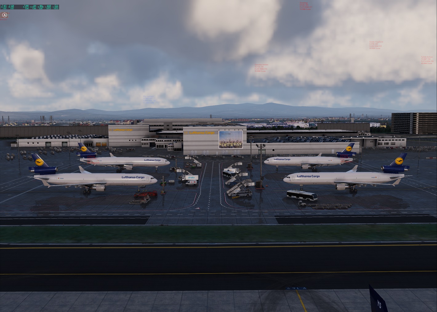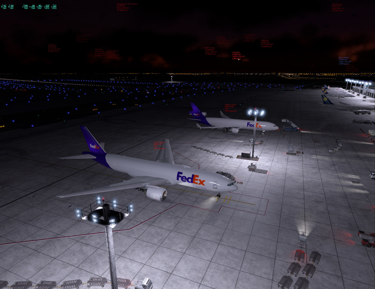 Kopfzerbrechen machte einerseits die B747-8 die 5,3m länger ist als die -400 und andererseits die riesige Spannweite der A380 mit ihren 80m. Kurzum, ich äugte und sägte an allen Positionen. Auch die LH-Frachterpositionen im Westen (in mir schlägt immer noch das LH-Frachterherz 😉 ) mussten angefasst werden, damit da die richtigen Flieger stehen (LH-MD11F, LH, bzw. Aerologic-777F). Weiter westlich wurde der kleine Fedex Hub mit 3 Positionen aktiviert. Die Fedex Flieger wiederum waren bei Traffic Global zunächst nicht enthalten, waren aber im Netz zu haben. Dazugefügt. Sehen schick aus. Im Vergleich zu früher sehr gute Optik, was heutzutage -sogar kostenlos- erhältlich ist. Mit erträglichen Einbußen der fps.