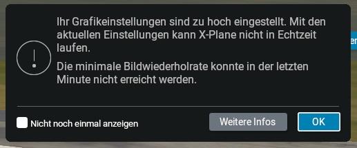 Trotzdem kommt es relativ häufig zu Spontanabbrüchen (crashes). Meistens ging eine Warnung voraus, dass die Bildwiederholrate von 20 fps zu hoch ist. Habe sie dann halbiert. Richtig gut läuft es erst im so genannte "Safe Mode", den ich jetzt immer schon selbst aufrufe durch Drücken der STRG-Taste (CTRL) beim Starten von X-Plane12.exe. Das hat dann eine Reihe von Grafikeinschränkungen zur Folge. Aber daran bin ich ja irgendwie selber Schuld, wenn ich mit einem VRAM von 2048MB daher komme und einer Grafikkarte, die eigentlich gar keine ist.
