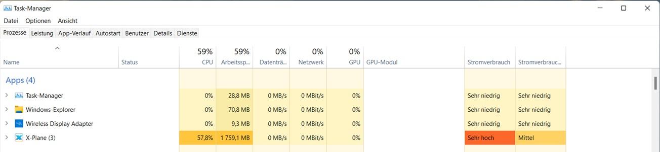 Jetzt habe ich mit etwas Mühe die Installation von X-Plane 12 auf meinem Lenovo Laptop mit AMD Radeon Graphics hinbekommen. Es waren Treibernachinstallationen notwendig. Die Demo-Version lief bereits anständig. Nachdem ich die Vollversion gekauft habe, wollte ich richtig loslegen. Aber leider bleibt der Simulator immer beim "Rendering" stecken. Der Fortschrittsbalken mit der Bezeichnung "Rendering wird begonnen" bleibt auf dem Niveau von etwa 10% stecken. Auch nach Stunden bewegt sich nichts. - Rendering ist nach meinem Verständnis etwas, dass ständig laufen muss in Echtzeit, oder? Es darf natürlich sein, dass ein paar Szenen zur Vorbereitung im Hintergrund hinterlegt werden. Aber das darf doch keine Stunden dauern, oder? Habe auch schon an den Grafikeinstellungen von X-Plane 12 herumgespielt und alles auf minimales Niveau gesetzt. Hat auch nichts geholfen. Habt ihr eine Ahnung woran das liegt? Wäre um jeden Tipp dankbar. Hier noch ein Auszug aus dem Gerätemanager. Und ein Blick in den Taskmanager zeigt, dass der Grafikprozessor gar nichts macht. Die CPU ist zu 60% ausgelastet. Der Lüfter läuft auf Hochtouren und mein Laptop wird warm. Renderingwirdbegonnen.thumb.jpg.95ae90f35669b514d03e11372548518e.jpg